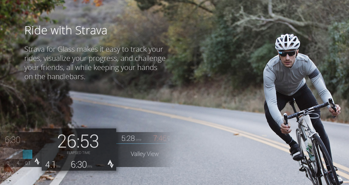 The only thing I find challenging with Strava is not having the ability to monitor my times and progress during a ride. Strava can give out audible splits but I've never felt it safe or practical to wear earphones while riding. I've also shelled out on a handlebar mount for my phone but quickly found out that I could only keep my phone display turned on for a limited amount of time leaving this impractical for all but the shortest of rides. I have to admit I am like a big kid a the prospect of being able to view my times, distance & segment results whilst keeping my hands firmly planted on the handlebars and my mind focused on my ride. Exciting times are ahead for this tech and I'm sure there will be endless ways we can incorporate the Google glass into more than just cycling as well. I for one am looking forward to the next round of updates and developments.