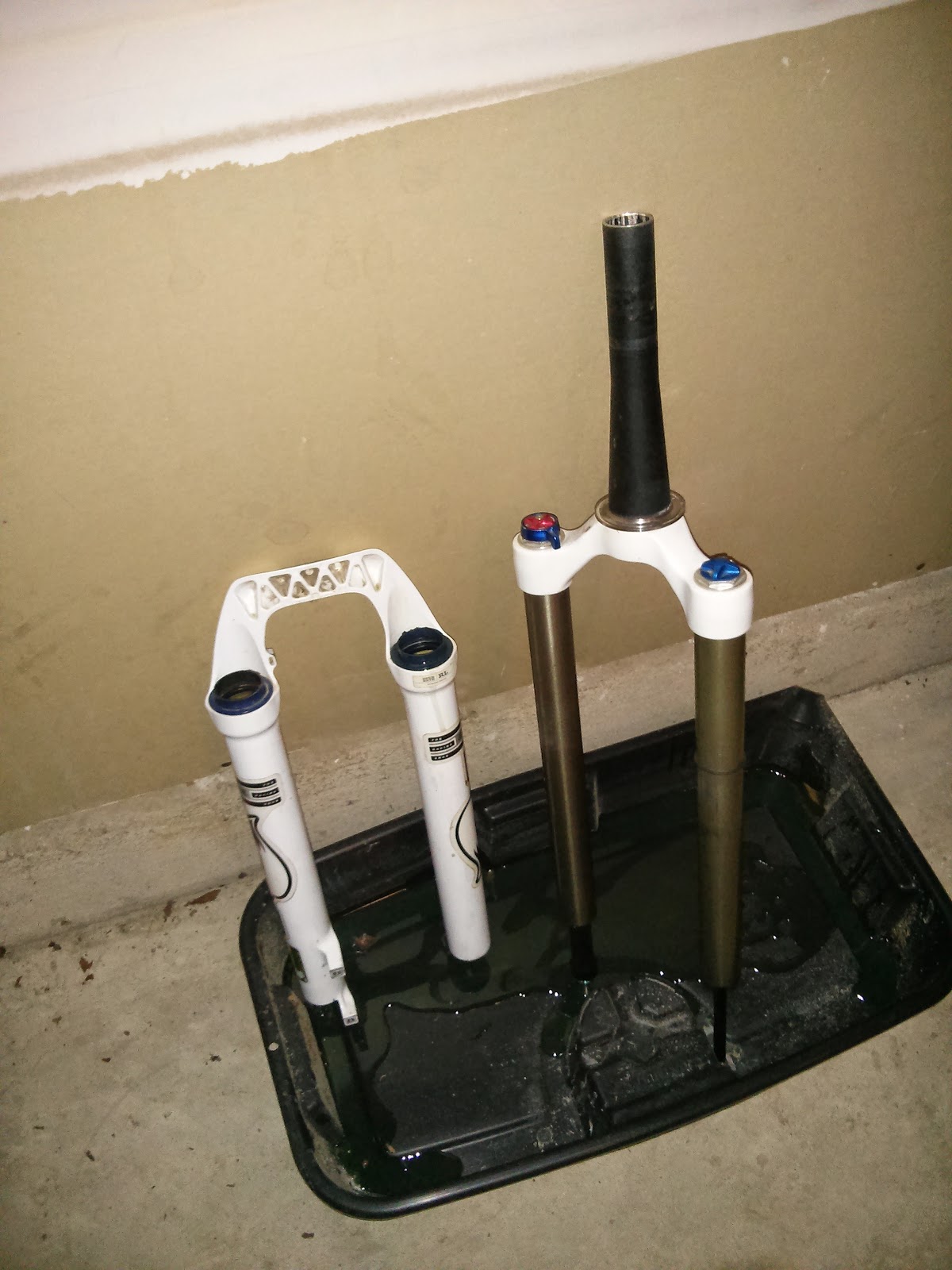 With the lowers seperated from the stanchions next step is to drain the oil into a suitable container.